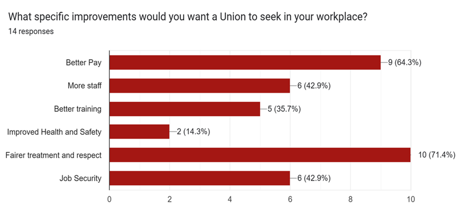 “Fair treatment and respect” came out as the top thing that respondents would want to see a Union achieve in their own workplace: