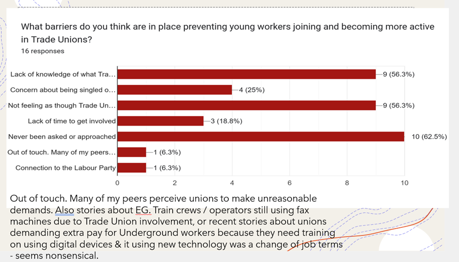 The responses we did get came mainly from older young workers (62% between 25-35), who were mostly in full-time jobs (81%). So, our small sample was arguably not particularly typical. Even so, 75% of our respondents were still not union members, and 75% of those who were not members had not been members at any time before.